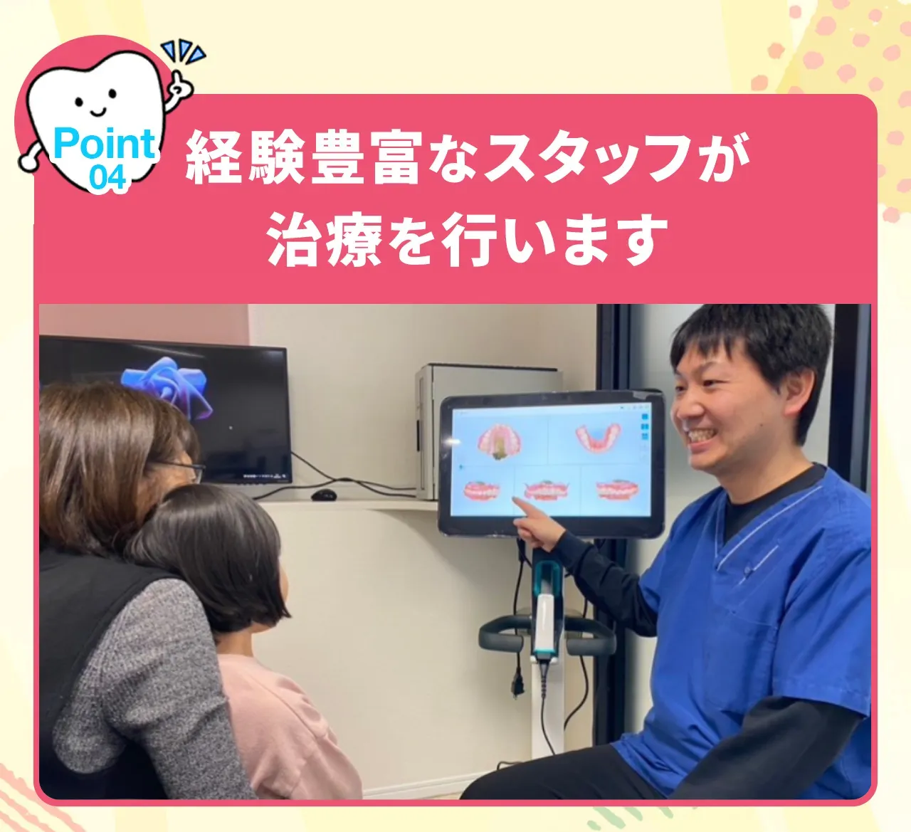 歯科用3Dカメラ(iTero)を使ってお口の中の撮影を行います。3D写真から現在の問題点や改善策、治療後のイメージをお話します。